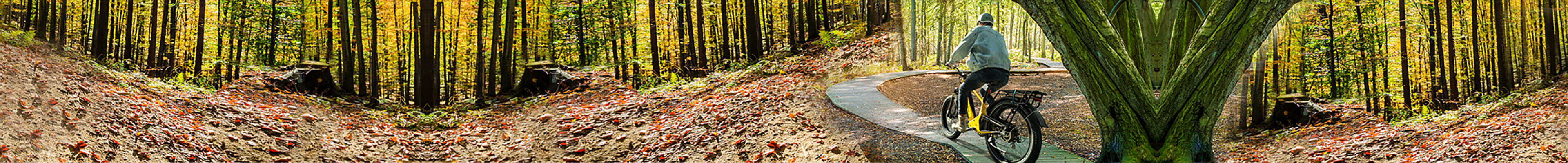 Magicycle Deer Step-Over Full Suspension Yellow Ebike for recreational riding Rider on yellow Magicycle Deer ebike in orange jacket on forest trail