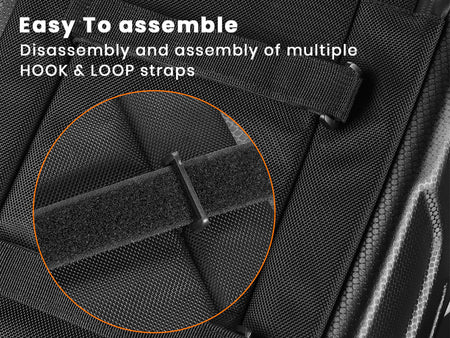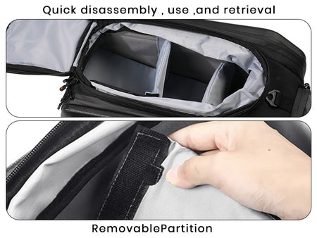 The storage bag includes a 10L main compartment, with 3 inner removable partitions (when placing the ebike battery, need to remove the partitions, and put it from the side opening), helping to get your essentials well organized. With a large opening on the top, making it easy to take and store.