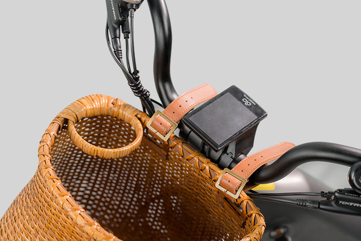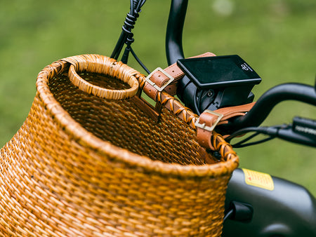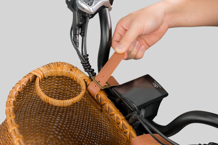 Find a suitable position on the handlebar and pass the PU strap through the rattan basket hole